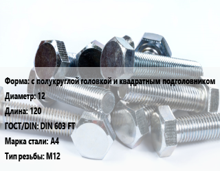 Болт с полукруглой головкой и квадратным подголовником 12х120 DIN 603 FT Сталь: А4 М12, цену уточнять, кг цена от 157.08 ₽ / кг, где купить, условия доставки в Екатеринбурге и Свердловской области