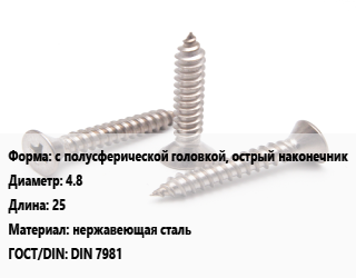Саморез с полусферической головкой, острый наконечник D=4.8 L=25 нержавеющая сталь ГОСТ: DIN 7981
