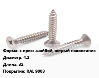 Саморез с пресс-шайбой, острый наконечник D=4.2 L=32 RAL 9003, упаковка 500 шт, белый цена от 360.92 ₽ / кг, где купить, условия доставки в Екатеринбурге и Свердловской области