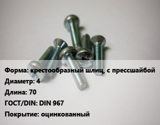 Винт крестообразный шлиц, с прессшайбой 4х70 DIN 967 оцинкованный
